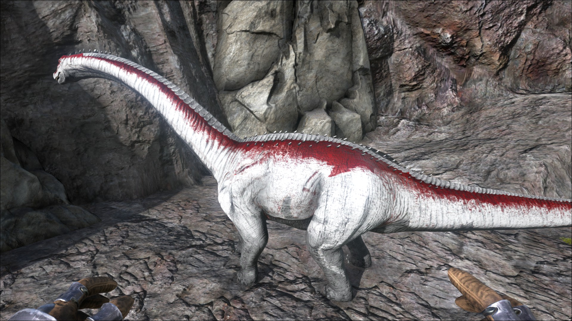 Despite its massive range, the Brontosaurus is very slow in terms of movement and attack rate. Their massive size allows them to be stuck behind cliffs and large boulders much easier than others. They also will attempt to retreat when wounded, where it won't fight back but can still deal damage if players are under it. It should also be noted that, from the front, their tail hits either to the left or right and can be dodged by strafing the opposite direction quickly. Using this technique it is easily possible to slay a Bronto without taking any damage on foot with a bow or crossbow.