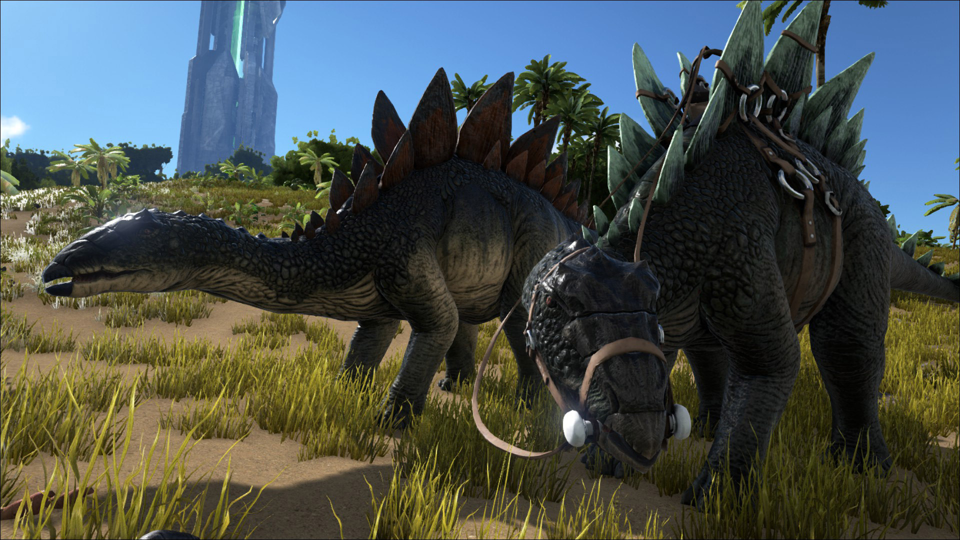 - War Mount:A tamed, mounted Stegosaurus with full stamina is basically invincible, as they can deliver damage without touching their opponent, allowing you to take on powerful creatures like Spinosaurus and Paraceratherium and come out unharmed. The only disadvantage is their attack range may strike unintended targets, destroying your tame efforts and starting unnecessary fights with other animals. When fighting with a stegosaurus, make sure to have its tail side facing the enemy, further increasing its attack range while potentially negating the enemy's attacks. The heavy plate mode works in this role where players who are riding stegosaurus' can leisurely defeat creatures that need to close in the distance to get their attacks in. The hardened plate can make stegosaurus take far more damage. The sharpened plate mode is PVP oriented as it can pierce saddle armor. (Utilize between 3 backplate types for combat efficiency)