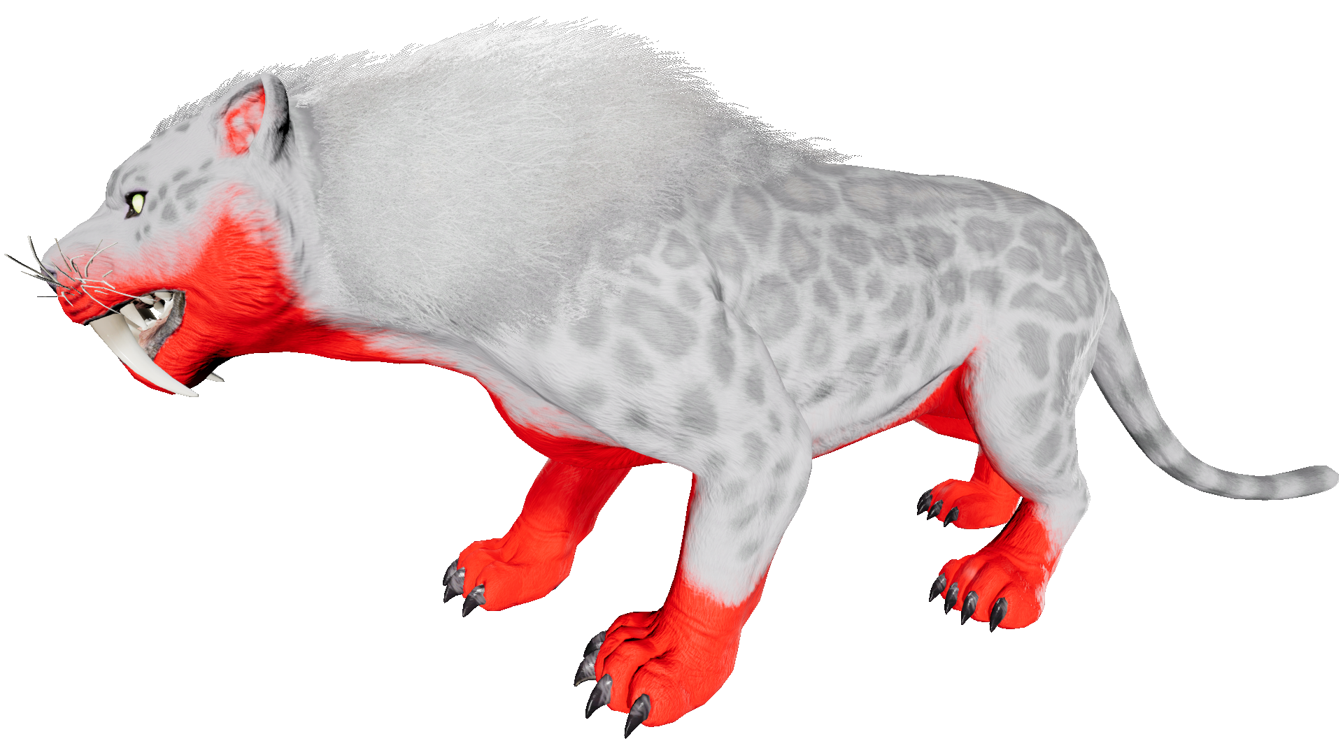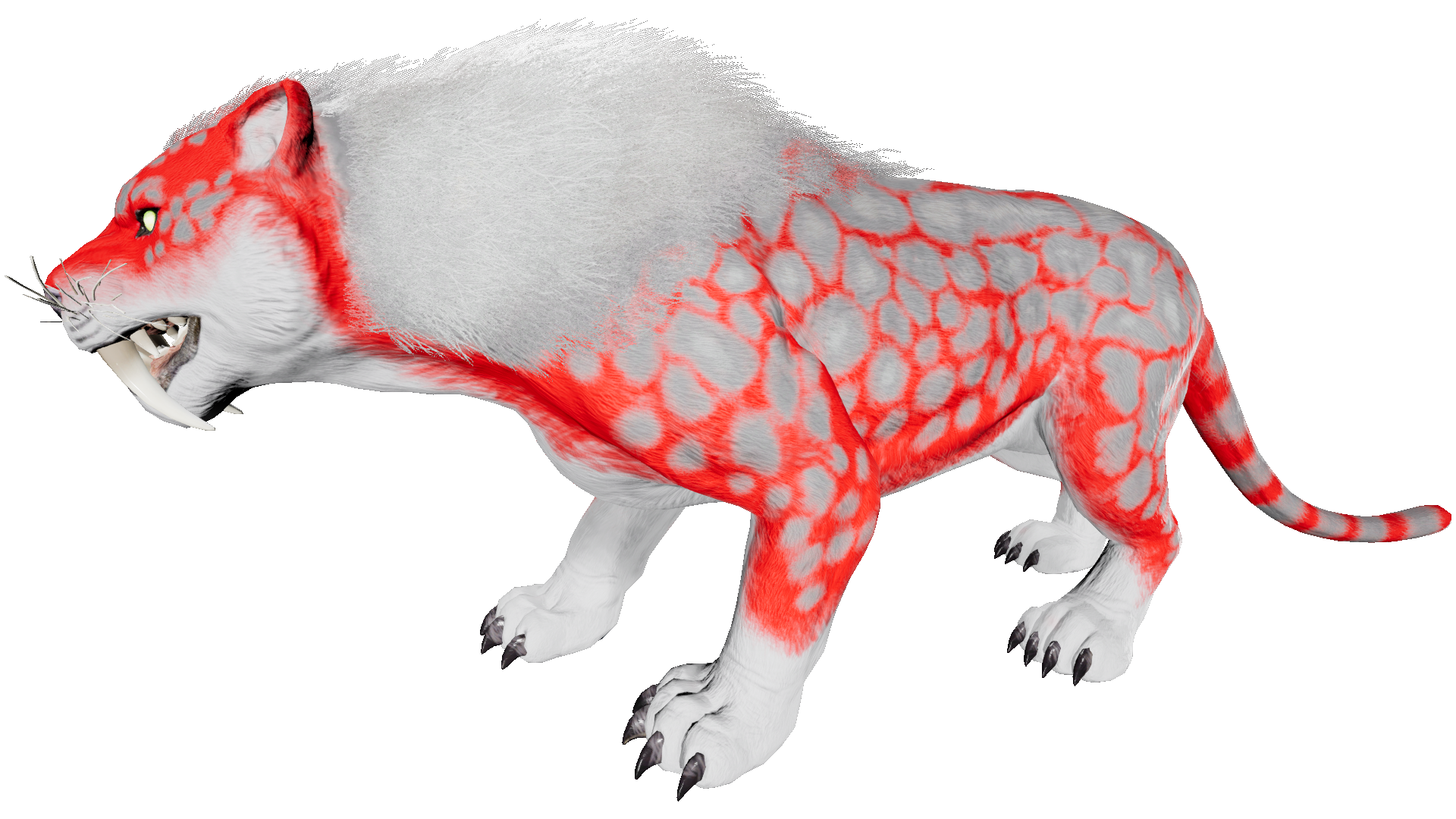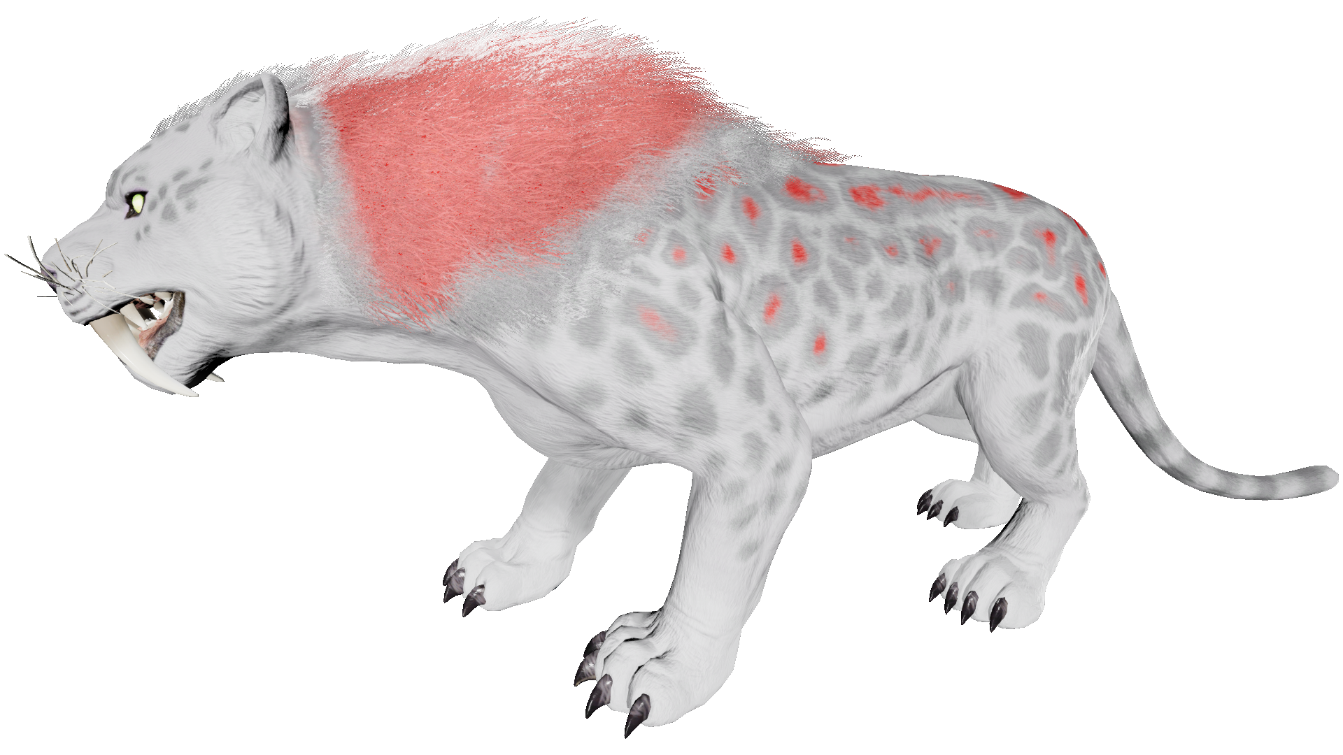 The Saber appears as a large cat with well-developed forelimbs and exceptionally long canines. The differences between it and its cousins in the fossil records are that it sports a longer, panther-like tail, its snout is seemingly shorter, and its head is more hunched to the ground. The ears are pointy like that of house cats. The fur on its head, upper torso, shoulders, and back is thicker and longer than the rest of its fur, which is textured with tiger-like stripes. The eyes are lime green with cat-like pupils. The nose is pink and panther-like. The snout also has noticeable whiskers.