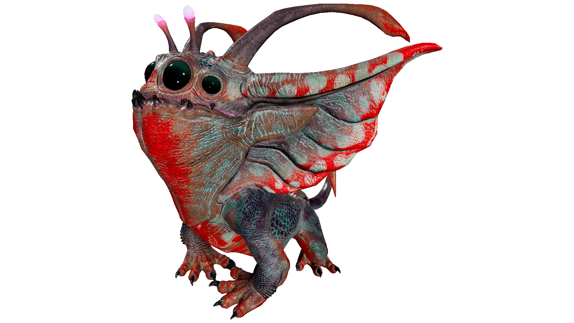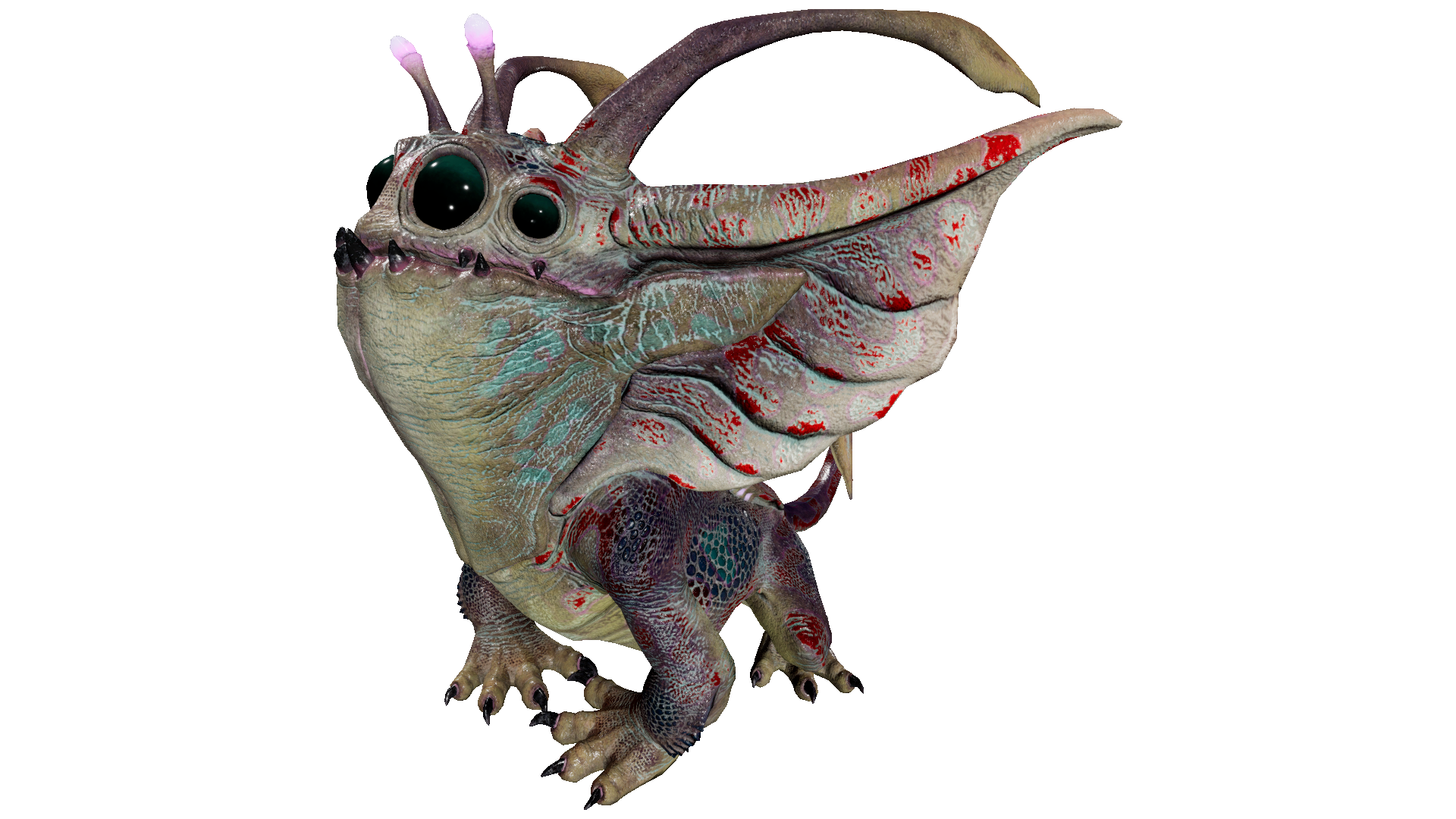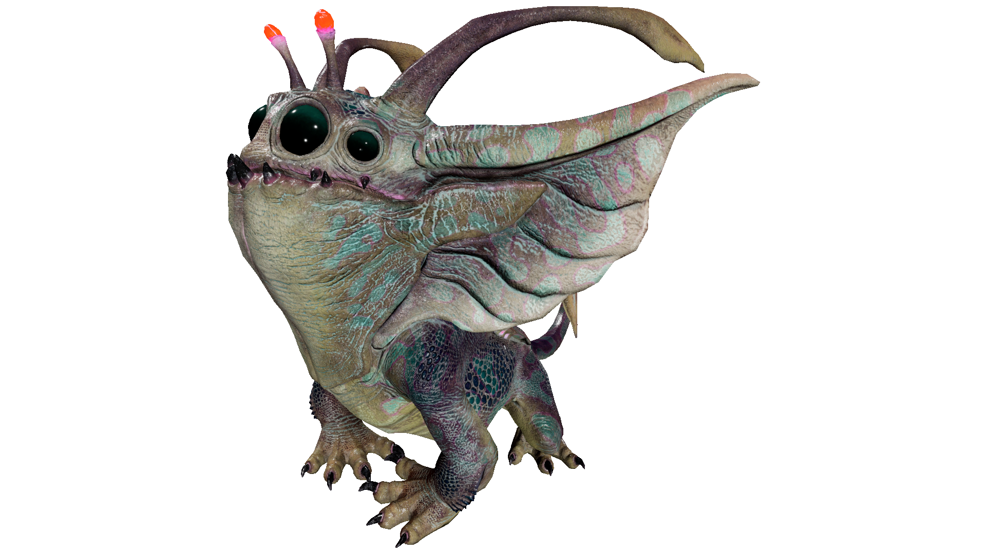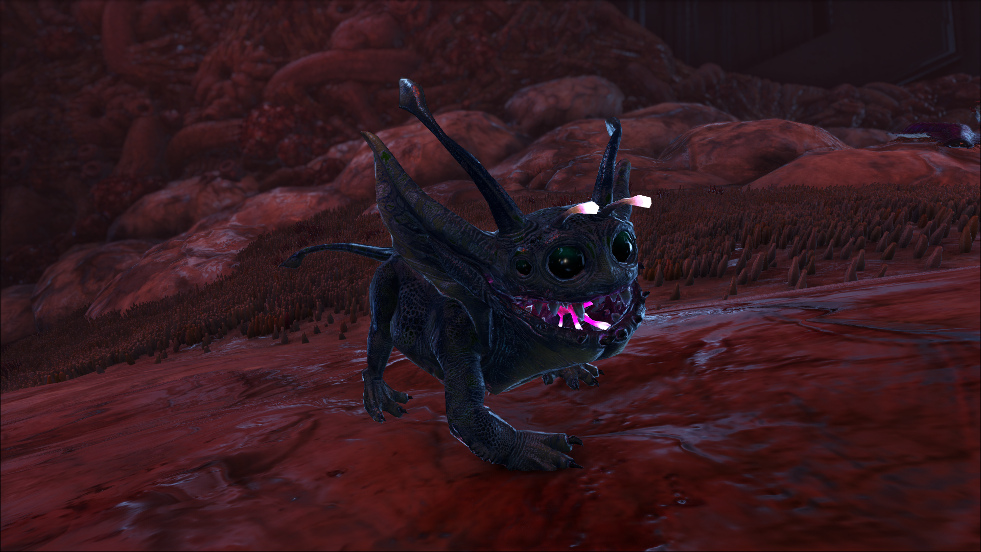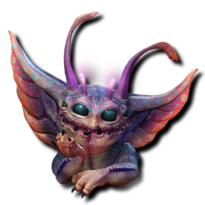 ノグリンは、先のとがった耳を持つ小さな生物発光するCreatureです。顎が割れていて、そこから光る舌とたくさんのギザギザの歯が見えます。