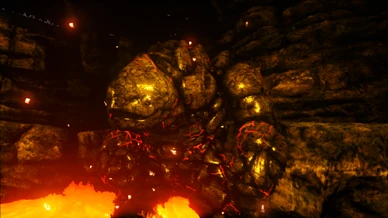 The Lava Elemental is encountered inside a volcanic cavern covered in crystals. The cave's center is a lava-filled lake with mayan ruins and tilted pillars (You can jump on). Opposite of the entrance is a location where players may hide and shoot down unto the Lava Elemental, whom will be fairly unable to attack you back.