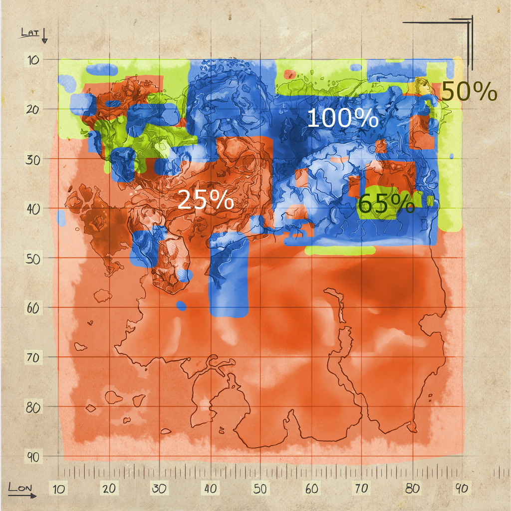 ゲーム内のどこにいてもHを押し続けると、(マップ名)風力 XX%が表示されます。この数値は、そのエリアに含まれる風の量を意味し、風力発電機(または風力発電機の配列)が発電するおおよその頻度を示します。不明な領域(Unknown)は100%としてカウントされます。Scorched Earthで荒野(Wilderness)とラベル付けされた地域は100%としてカウントされます。