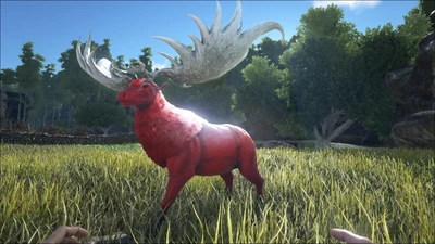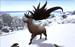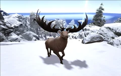 - Во время ARK: Winter Wonderland Большерогие Олени свободно бродят по всему острову из-за низких температур и снежной погоды. Ему можно дать специальный Костюм Северного Оленя, сделанный в Верстаке, который сделает его похожим на Рождественского Оленя.