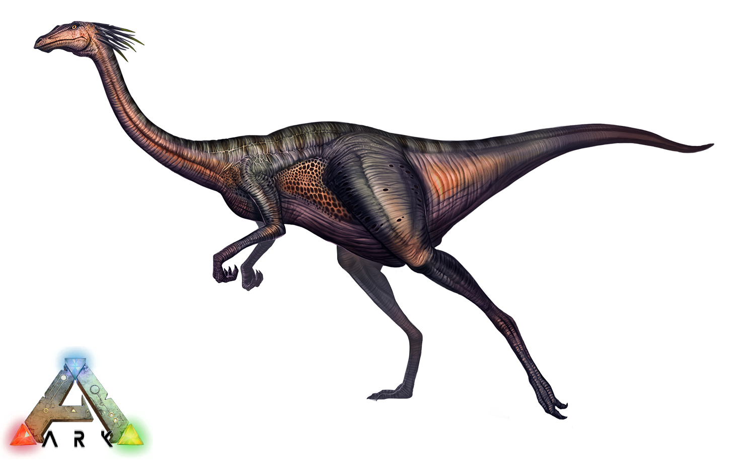Gallimimus is a large herbivore resembling something akin to a reptilian ostrich. Like an ostrich, it has a long neck and a beak for eating foods like grasses and berries. It has a slim build with a long tail to act as counterbalance when sprinting from predators like Carnotaurus and Raptors.