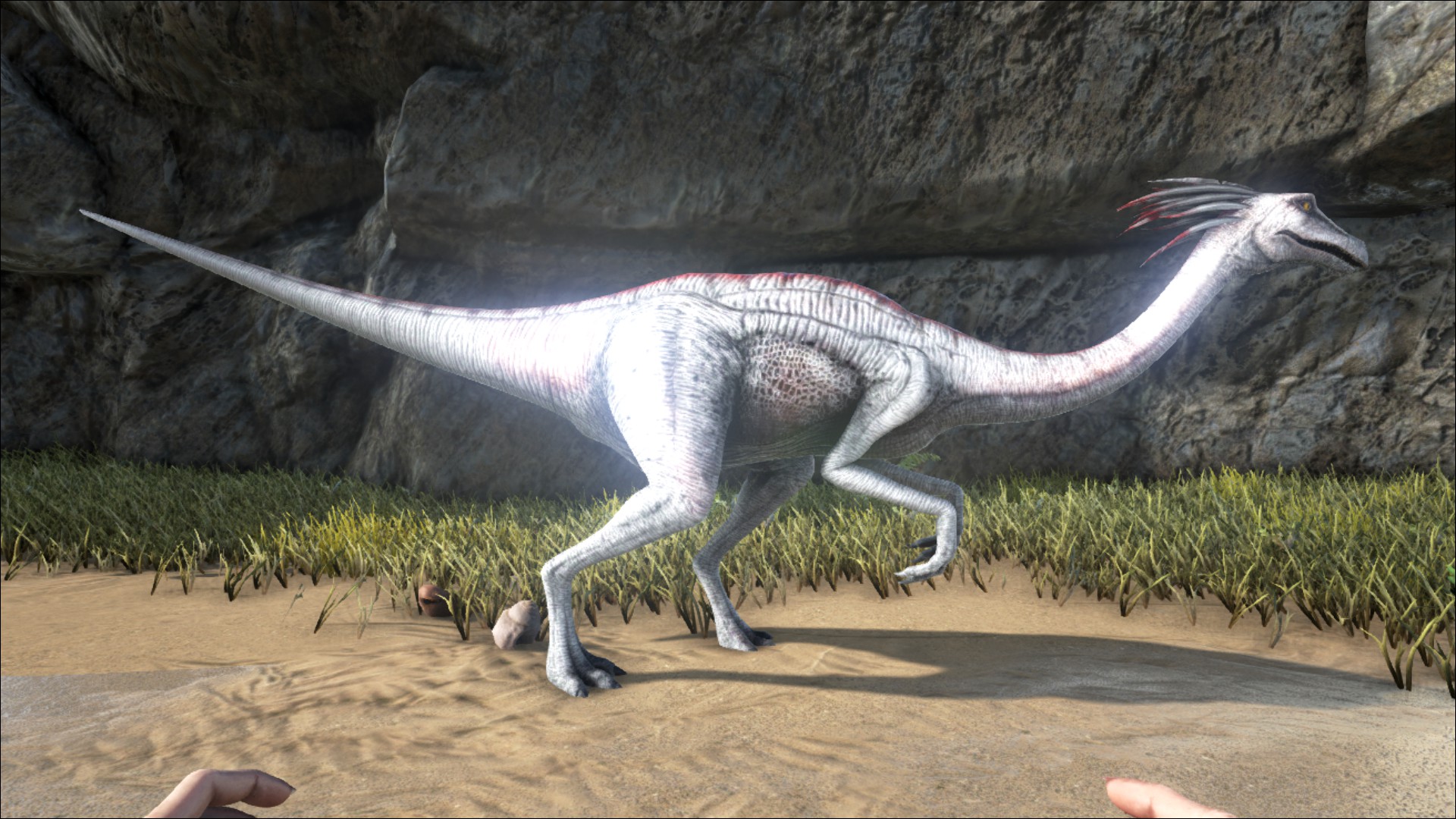 - Hunting: As of V253, the primary rider has the ability to use weapons while riding, meaning Gallimimus may now be used as a solo hunting mount despite the weakness of its own attack. Its low weight capacity means that the weapons, gear and taming supplies that can be brought along are limited, but provided it is not overloaded or ridden into water, Gallimimus provides the ability to snipe targets from a distance and then retreat before almost anything can close the distance.
