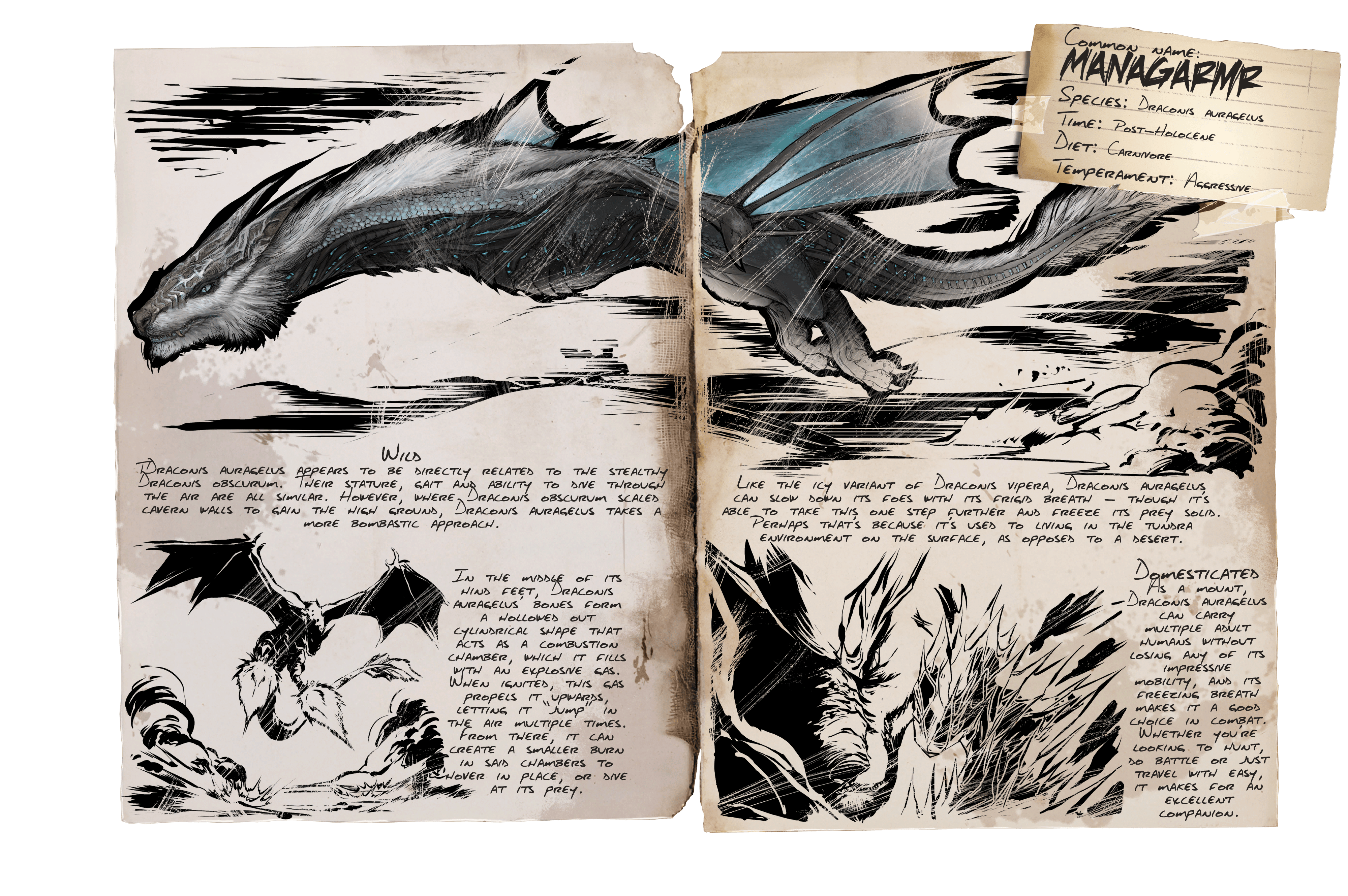 - В отличие от других видов драконидов Виверны и Скального Дрейка , Манагарм может быть приручен непосредственно насильным путем (с помощью оглушения), может быть выведен и не требует специализированного питания для малыша. Это вместе с его мехом предполагает что, в отличие от рептилий Виверн и Скальных Дрейков, Манагарм на самом деле является млекопитающим.