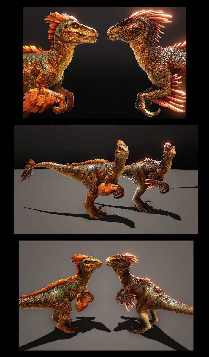 Паразауролофа), с длинными перьями на голове, спине, хвосте и на лапах. Он имеет разнообразие цветов, хотя зеленый, серый, бурый, пламенно-красный, песчаный и красно-коричневый, кажется, наиболее распространенные. Перья обычно ярко окрашены, в отличии от тела. Часто встречаются бурые Рапторы с красными перьями.