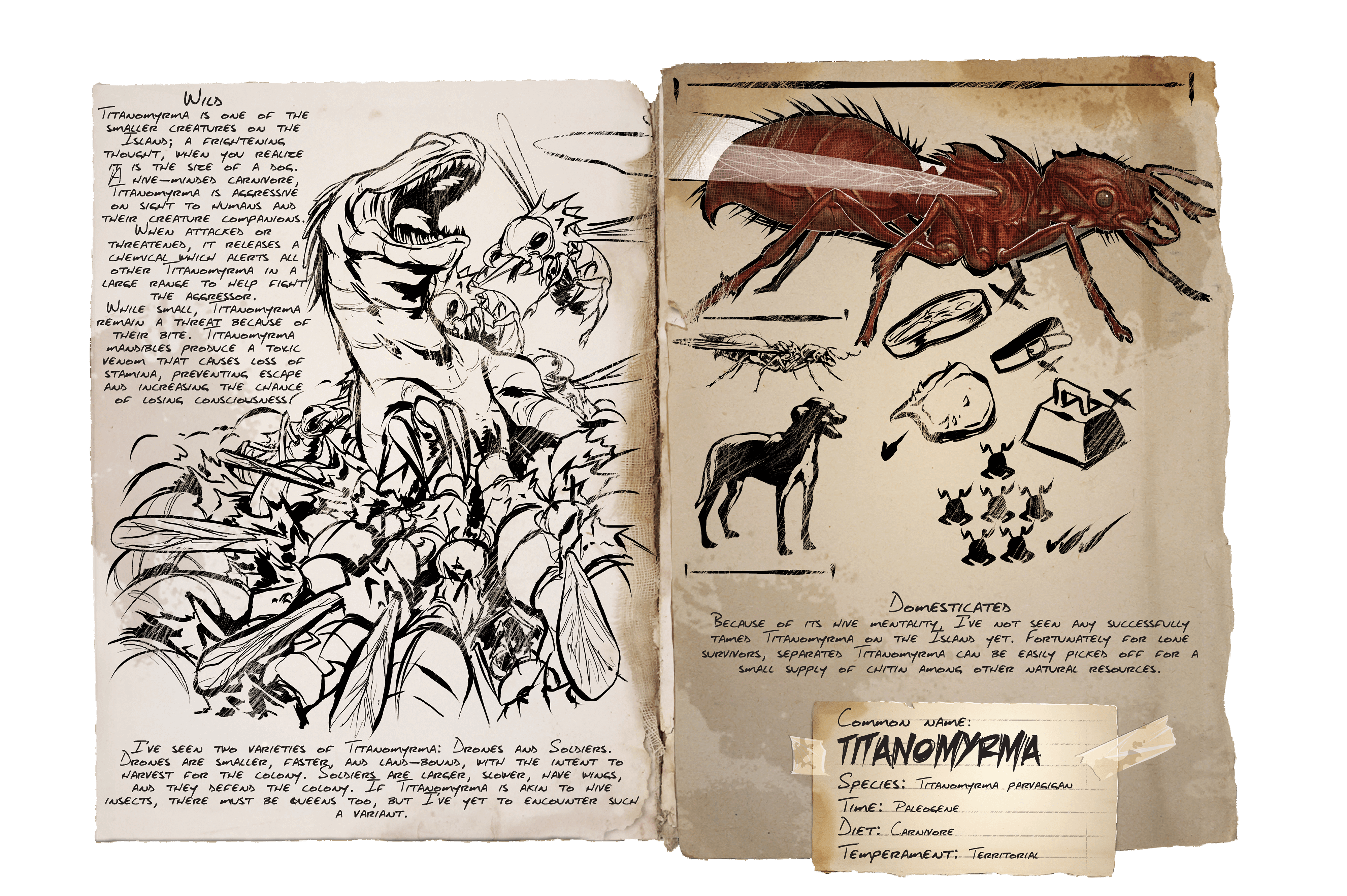 Titanomyrma is one of the smaller creatures on the Island; a frightening thought, when you realize it is the size of a dog. A hive-minded carnivore, Titanomyrma is aggressive on sight to humans and their creature companions. When attacked or threatened, it releases a chemical which alerts all other Titanomyrma in a large range to help fight the aggressor. While small, Titanomyrma remain a threat because of their bite. Titanomyrma mandibles produce a toxic venom that causes loss of stamina, preventing escape and increasing the chance of losing consciousness. I've seen two varieties of Titanomyrma: Drones and Soldiers. Drones are smaller, faster, and land-bound, with the intent to harvest for the colony. Soldiers are larger, slower, have wings, and they defend the colony. If Titanomyrma is akin to hive insects, there must be queens too, but I've yet to encounter such a variant.
