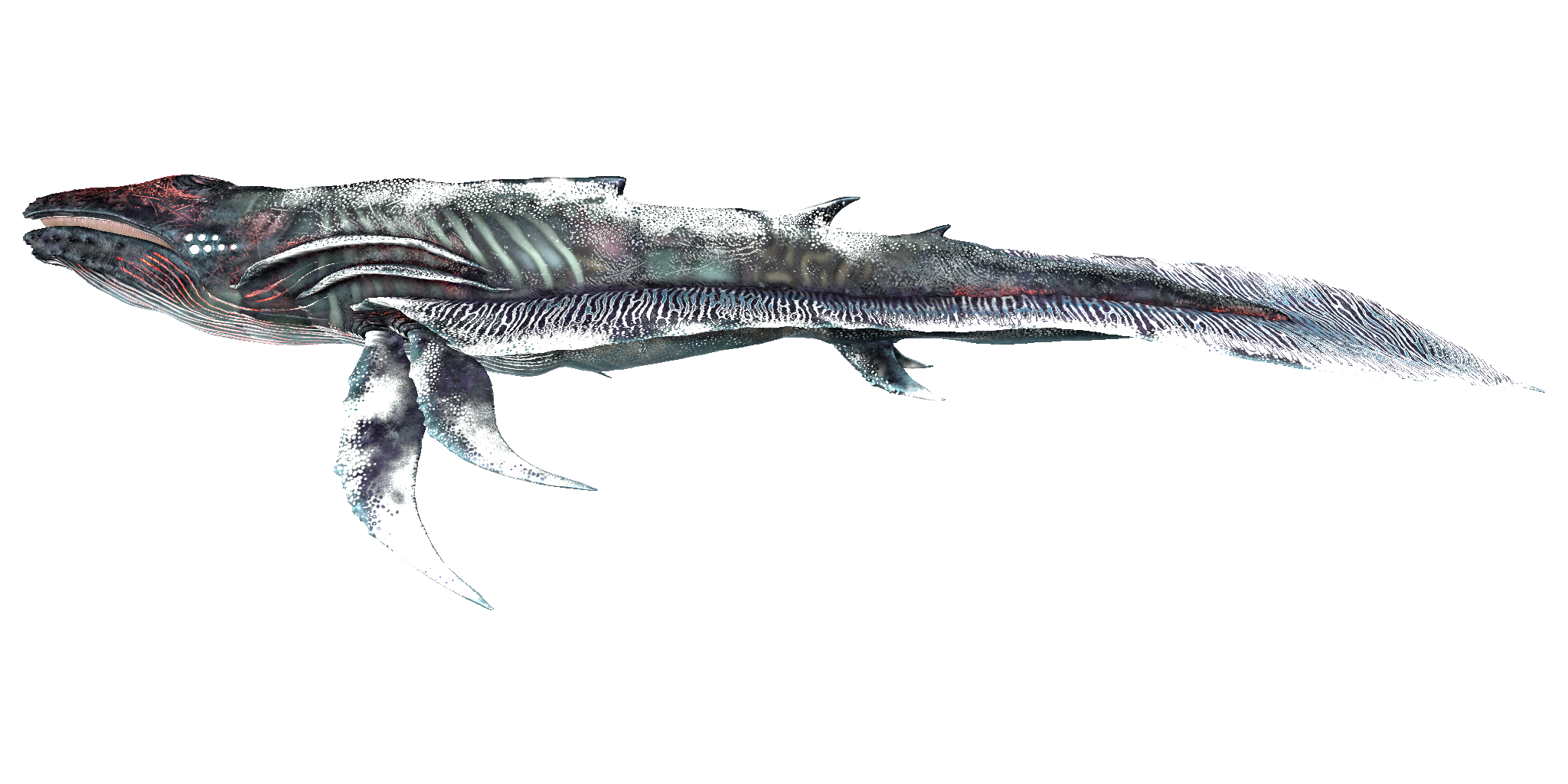 At first glance, the Astrocetus bears a close resemblance to extant baleen whales, such as the humpback, but it has 14 eyes, seven on each side, four pectoral fins, two pelvic fins, and small, slender wings that go all the way down each side of the body and ending in a point rather than two flukes. It also has translucent skin, thus enabling the player to see its insides.