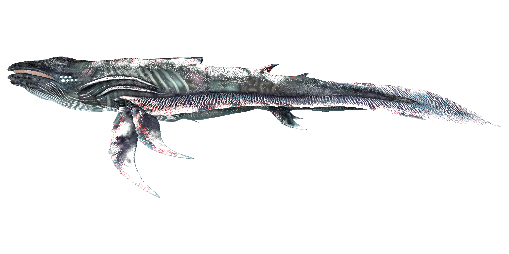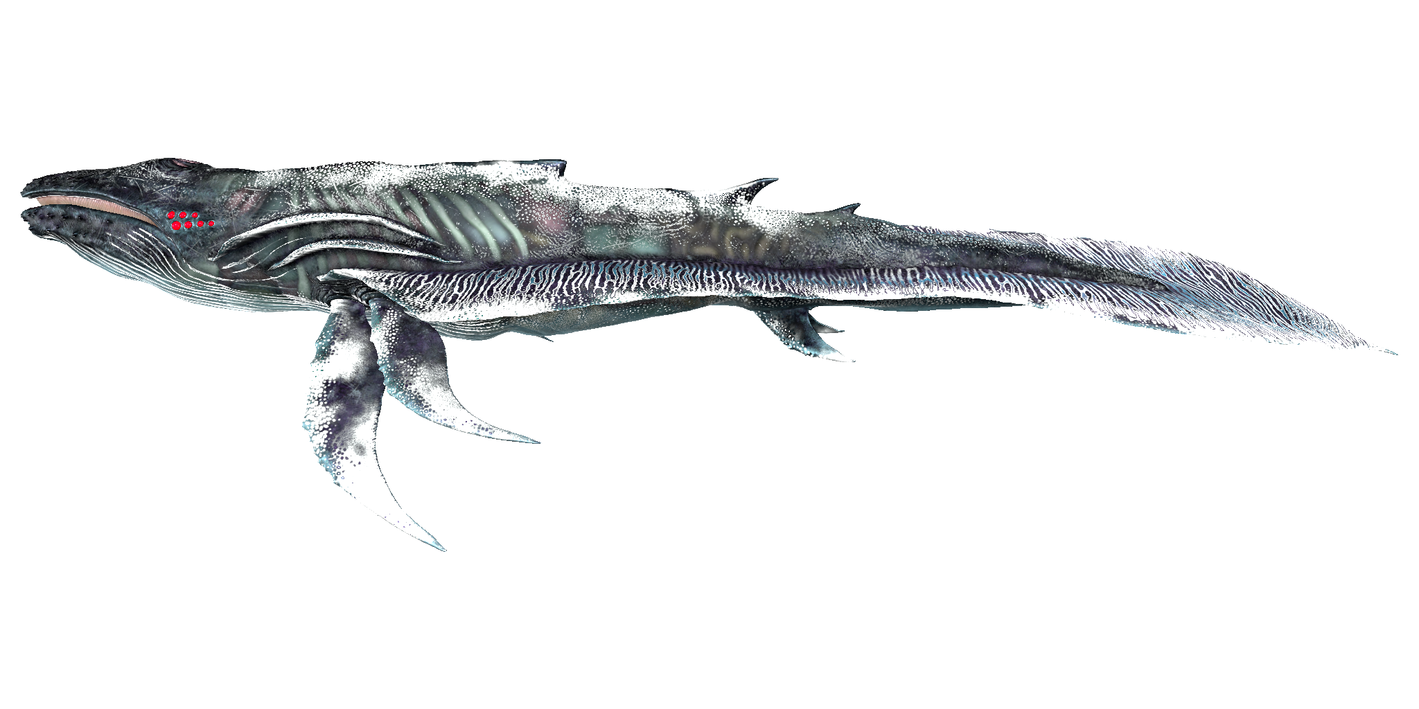This section displays the Astrocetus's natural colors and regions. For demonstration, the regions below are colored red over an albino Astrocetus. The colored squares shown underneath each region's description are the colors that the Astrocetus will randomly spawn with to provide an overall range of its natural color scheme. Hover your cursor over a color to display its name and ID.