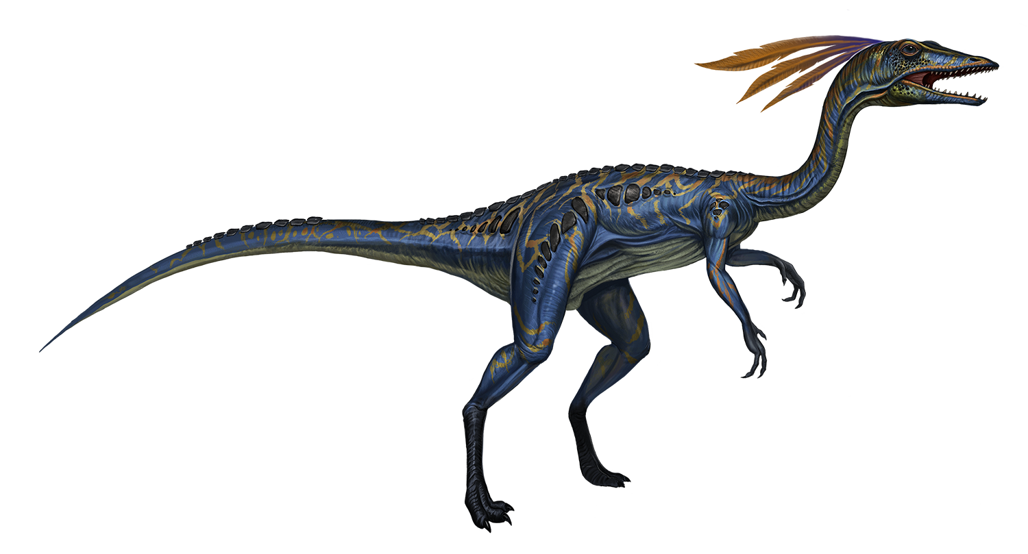 Compsognathus is a diminutive theropod, and perhaps the smallest of the island's many dinosaur species. It has a slim and graceful build with a narrow head on top a snake-like neck and a few large osteoderms running down it's sides and back. A few feathers decorate its head, presumably to impress mates. Lean, quick-moving, and smart, they are common in wetter regions where their primary prey - small reptiles, mammals, and insects - are in abundance. Compsognathus are highly social and are often found in groups; they are known to extend their inquisitiveness to humans when they find them, but curiosity can quickly turn to hostility should the pack grow large enough to pose a threat.