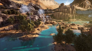 It's a lake in the Desert Dome, coming from the upper Geiser Falls, fed by The Cassinese Reiver and falling down in the Thundering Basin downward.