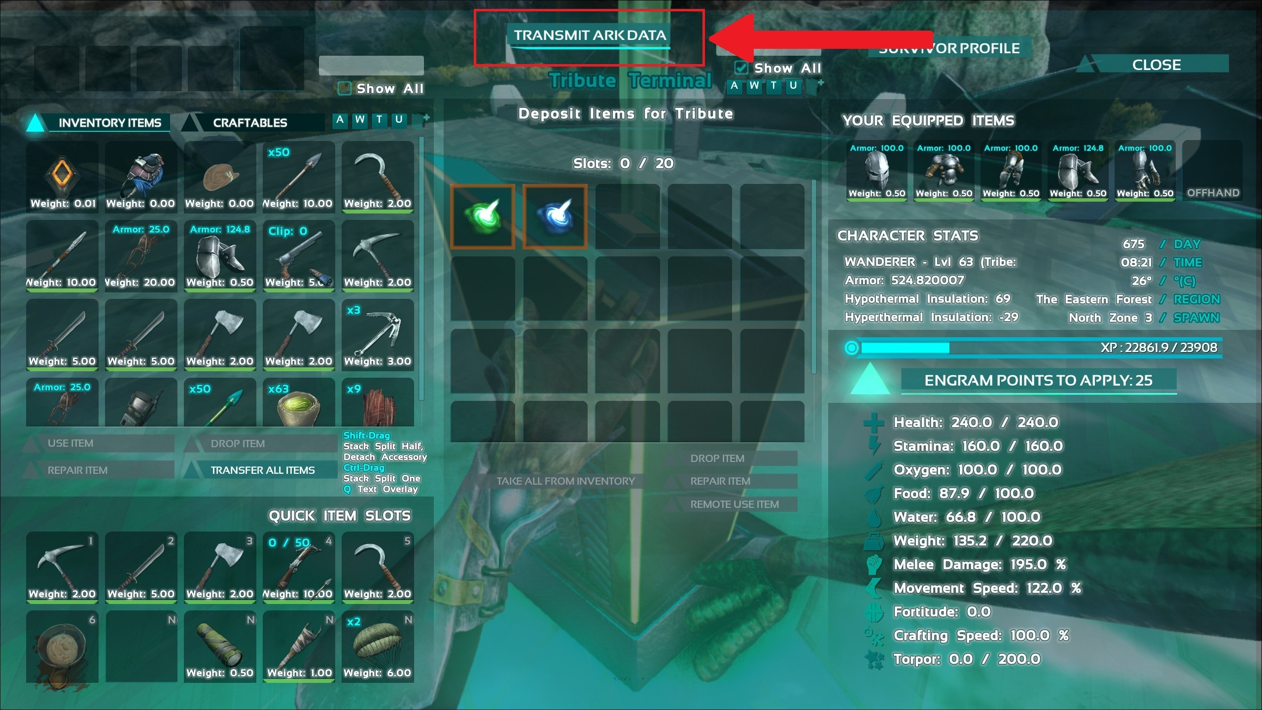Note: The process has been simplified even further. Survivors only need to place items in the ARK DATA inventory, and log off their current map. The game will do the rest for you