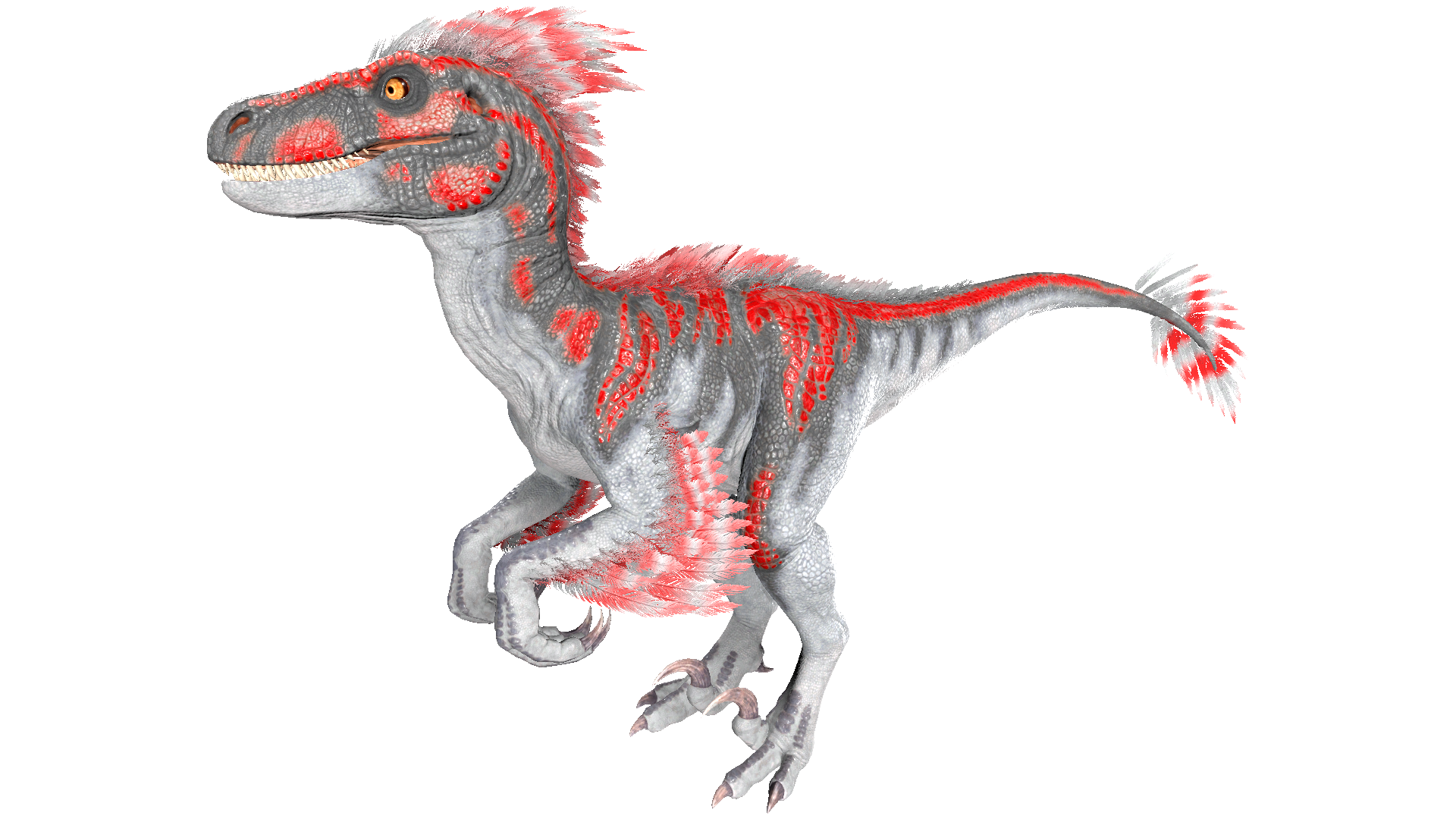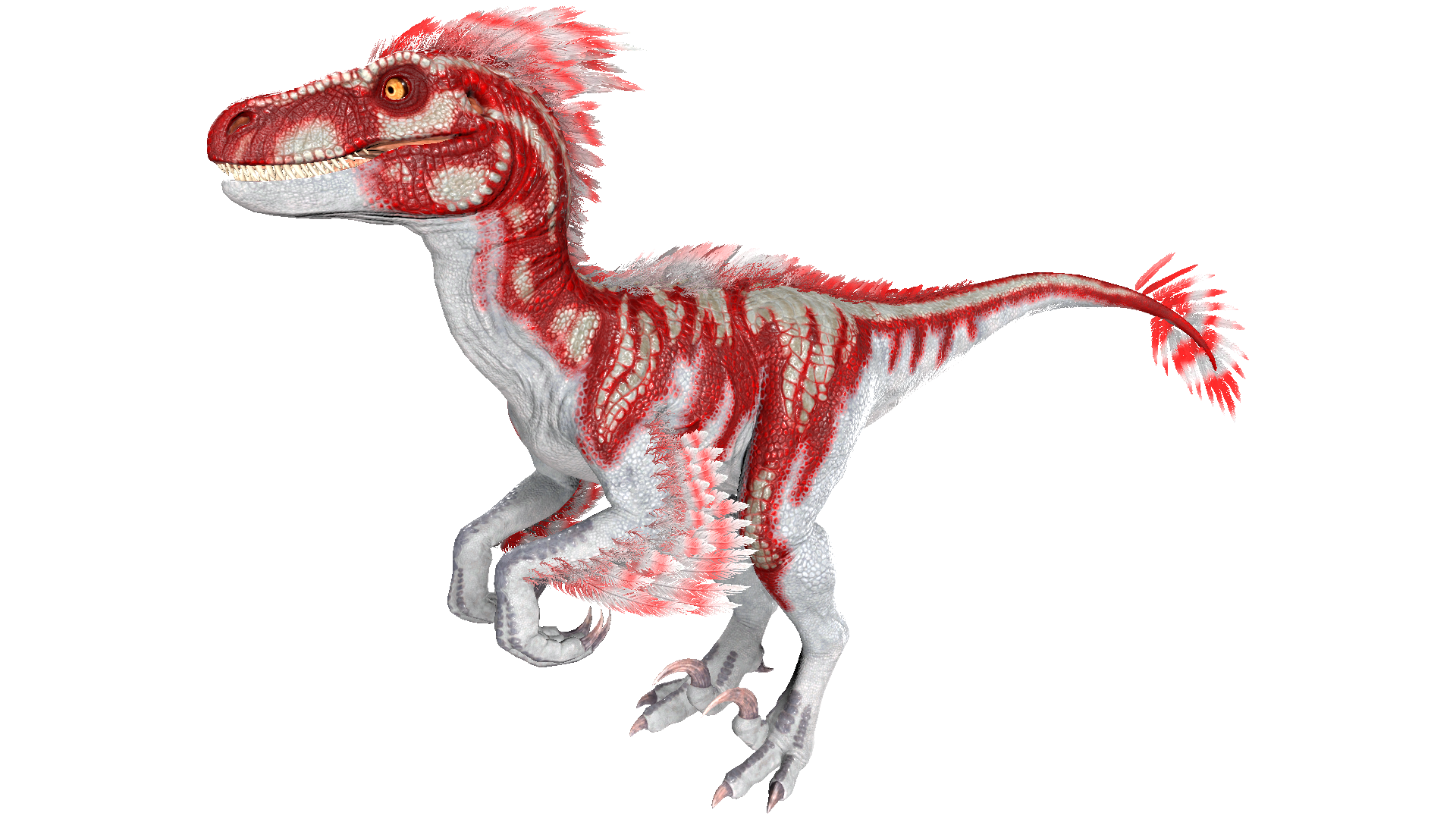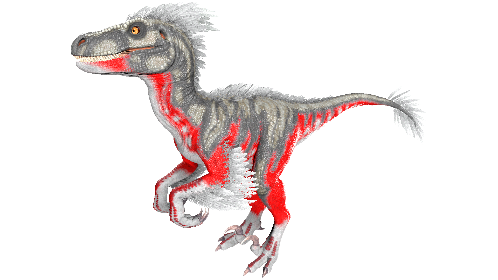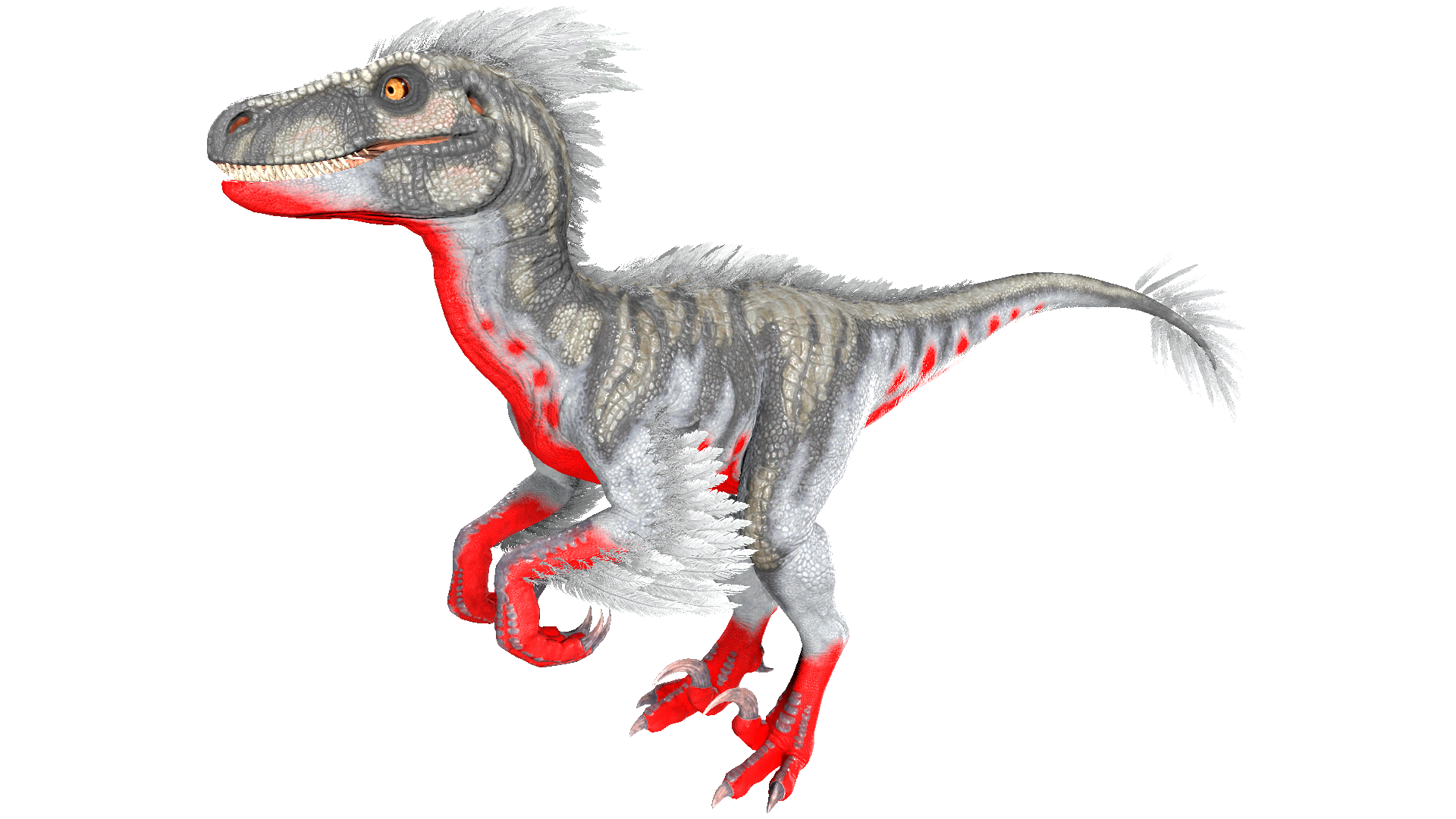 This section displays the Raptor's natural colors and regions. For demonstration, the regions below are colored red over an albino Raptor. The colored squares shown underneath each region's description are the colors that the Raptor will randomly spawn with to provide an overall range of its natural color scheme. Hover your cursor over a color to display its name and ID.